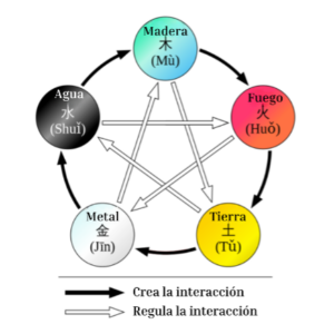 Estas energías complementarias, puestas en movimiento por el flujo del Chi, dan lugar a la expresión física de la unidad. A partir de esta comprensión, surge el Wuxing, la teoría de los cinco elementos.